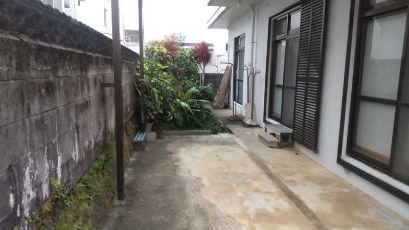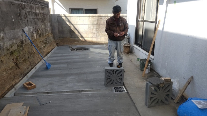 庭だった場所に重機を入れて樹木を撤去し、土間コンクリートを打設して駐車場を拡張。干場作成のために目隠しで花ブロックを積む